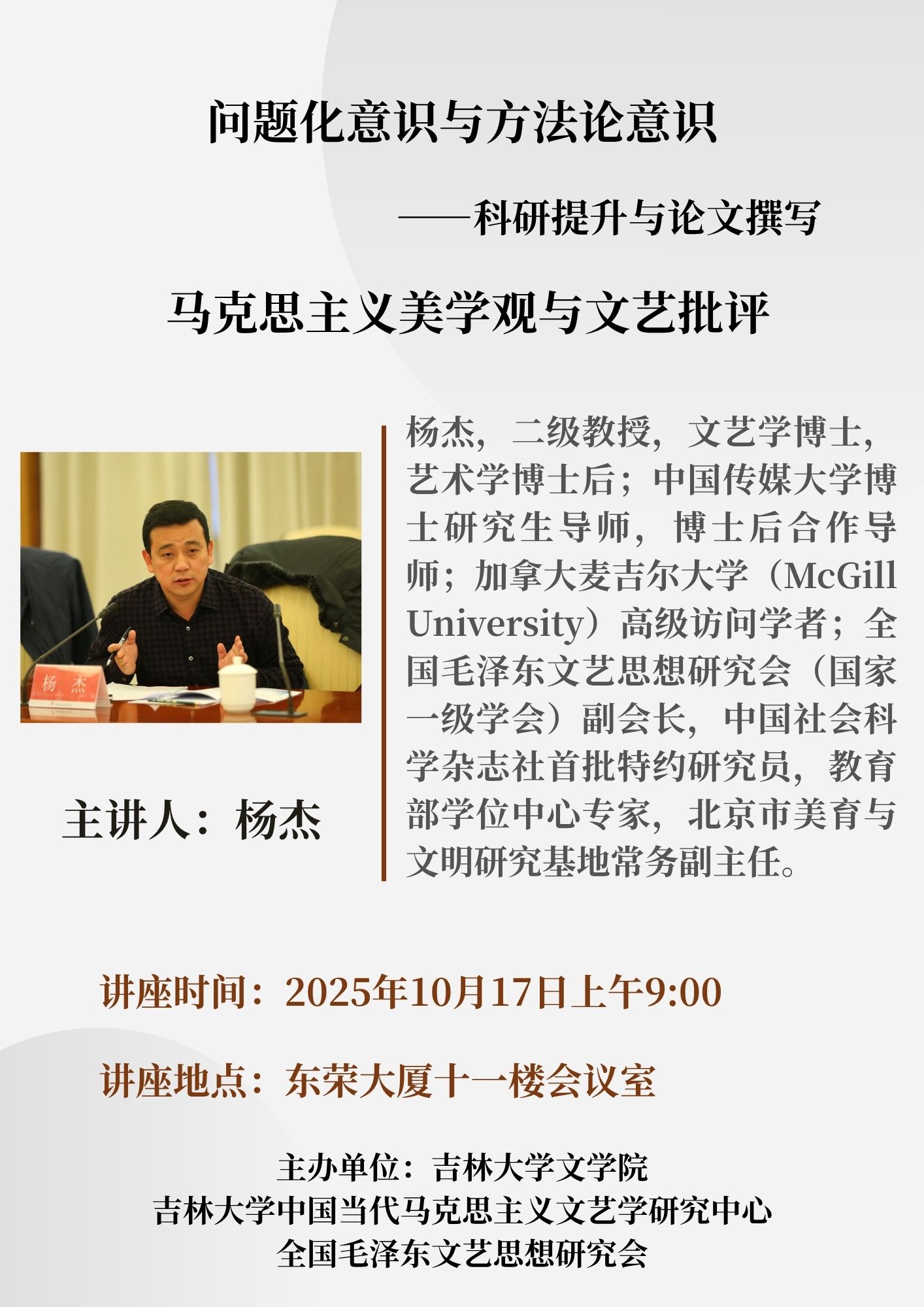 杨杰:二级教授,文艺学博士,艺术学博士后;中国传媒大学博士研究生导师,博士后合作导师;加拿大麦吉尔大学(McGill University)高级访问学者;全国毛泽东文艺思想研究会(国家一级学会)副会长,中国社会科学杂志社首批特约研究员,教育部学位中心专家,北京市美育与文明研究基地常务副主任。