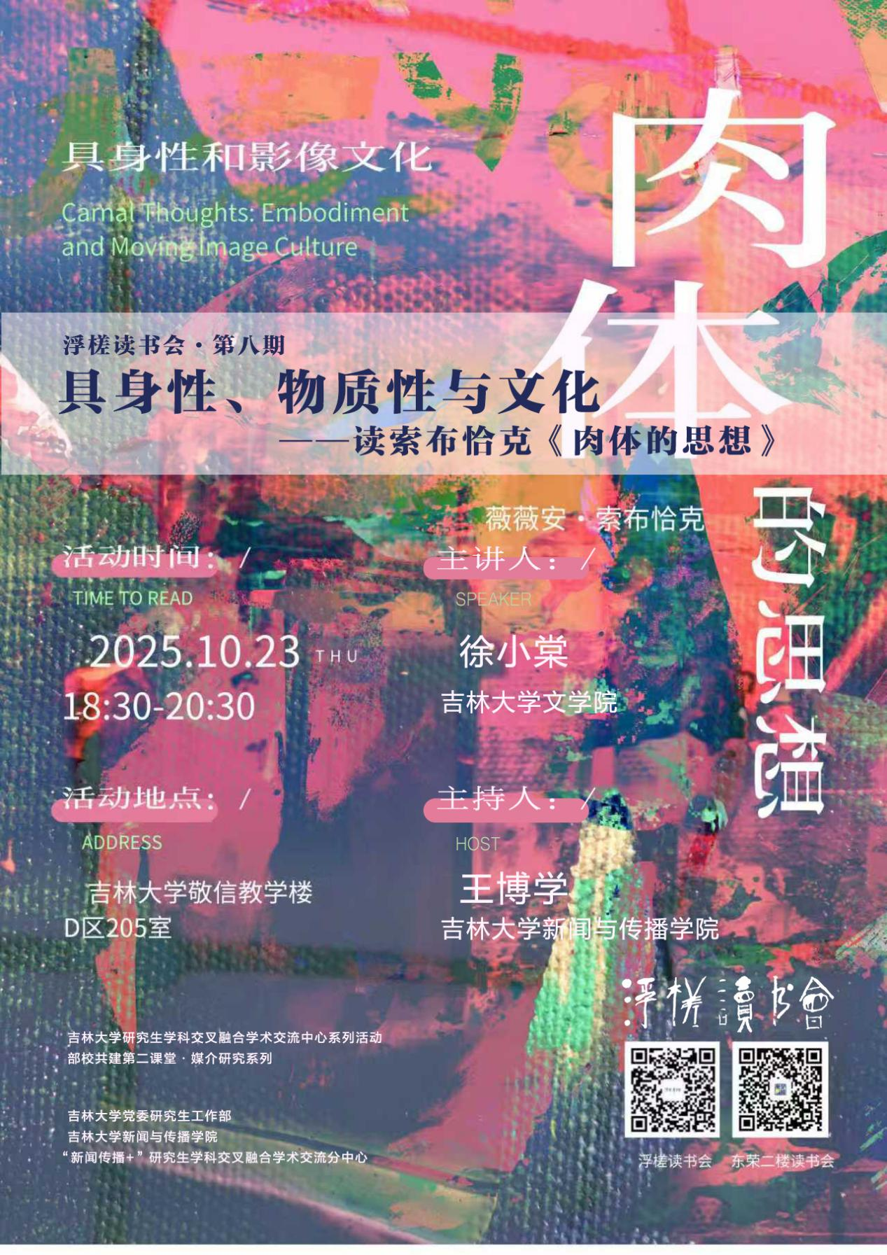 为活跃学术氛围,提升学科专业素养,拓宽学科交叉融合研究视野,强化学生运用理论视角观察、分析、阐释传播现象与文化现象的能力,特邀请吉林大学文学院文艺学教研室青年教师徐小棠博士做“具身性、物质性与文化——读索布恰克《肉体的思想》”专场主题研讨活动。具体通知内容如下: