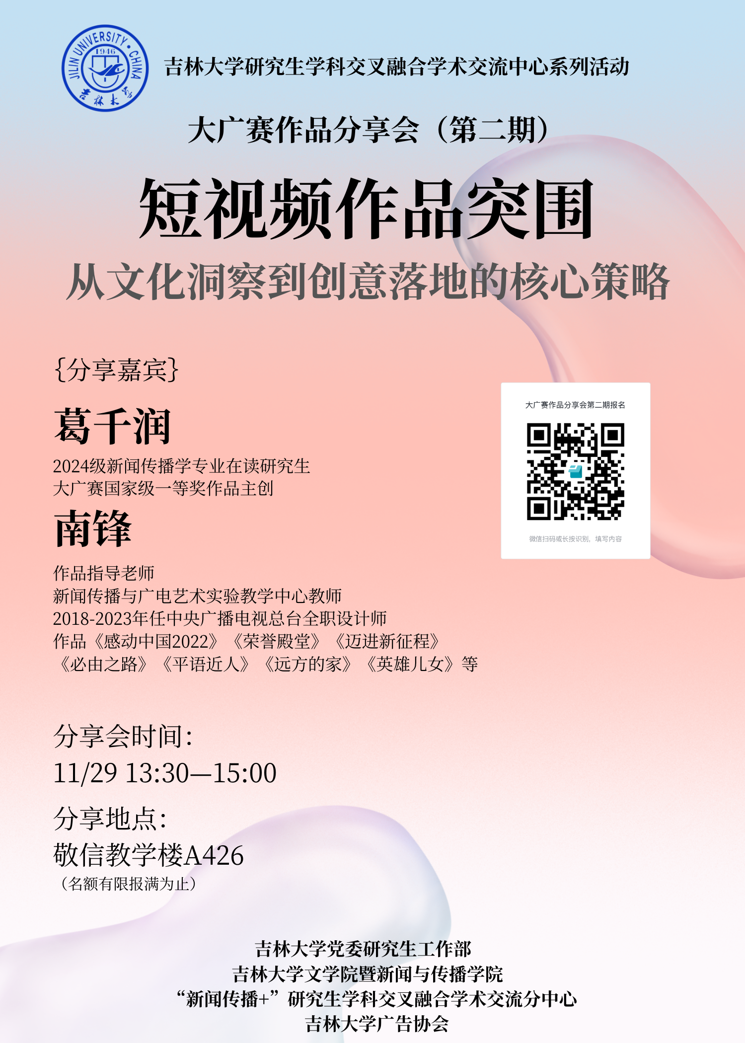 主讲嘉宾简介: 葛千润,吉林大学文学院暨新闻与传播学院2024级新闻传播专业在读研究生,大广赛国家级一等奖作品主创。