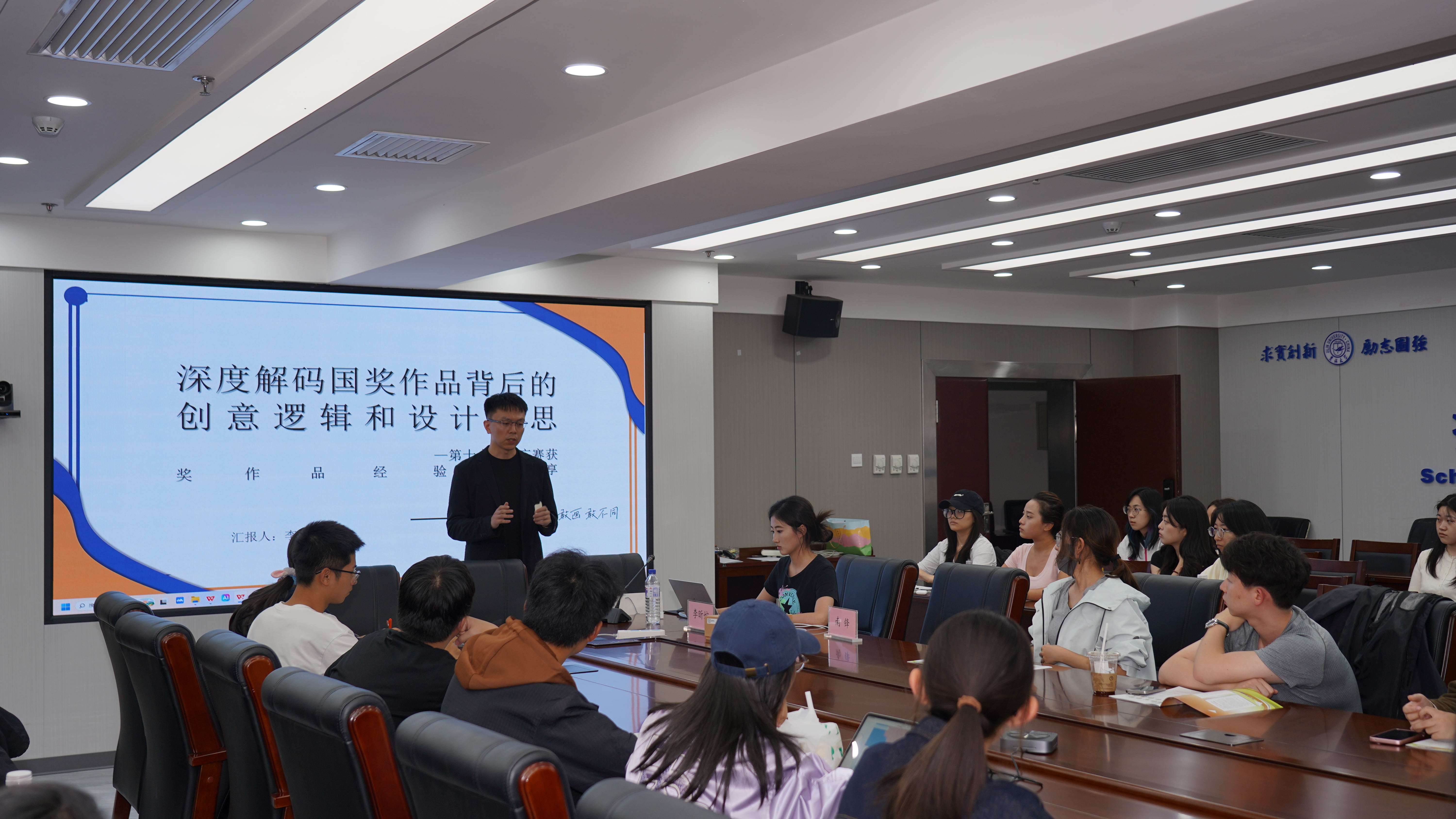 为深化研究生对高水平学科竞赛的理解,提升创新实践能力,推动学科交叉融合,9月28日,由吉林大学党委研究生工作部、吉林大学文学院暨新闻与传播学院、吉林大学“新闻传播+”研究生学科交叉融合学术交流分中心、吉林大学广告协会联合主办的“深度解码国奖作品背后的创意逻辑与设计巧思——大广赛分享会”在前卫南区东荣大厦十楼会议室成功举行。活动面向文学院、新闻与传播学院、法学院等各院研究生,由南锋老师主持,国家级获奖作品《甲骨新语》主创成员李昕婉同学作主题分享。
