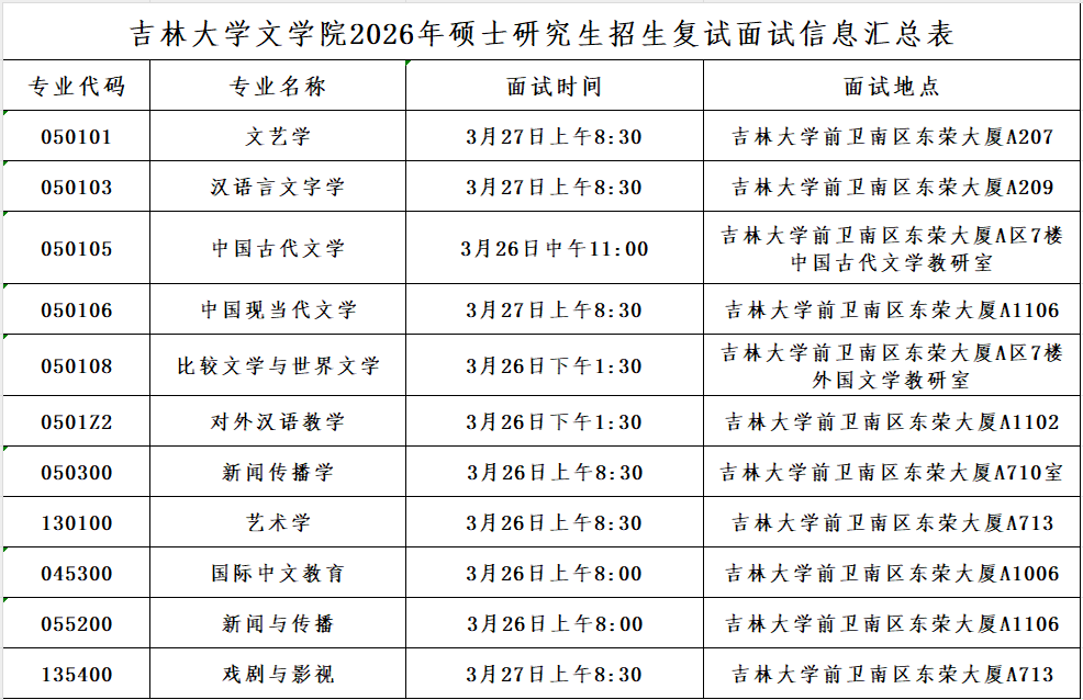 吉林大学文学院2026年硕士研究生招生复试面试工作安排如下: